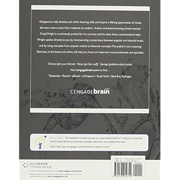About the Author Craig M. Wright received his Bachelor of Music degree at the Eastman School of Music in 1966 and his Ph.D. in musicology from Harvard University in 1972. He began his teaching career at the University of Kentucky and for the past forty years has been teaching at Yale University, where he is currently the Henry L. and Lucy G. Moses Professor of Music. At Yale, Wright's courses include his perennially popular introductory course, Listening to Music (also part of the offerings of Open Yale Courses); his large lecture course Exploring the Nature of Genius; and most recently his Coursera course Introduction to Classical Music. He is the author of numerous scholarly books and articles on composers ranging from Leoninus to Bach. Wright has also been the recipient of many awards, including a Guggenheim Fellowship, the Einstein and Kinkeldey Awards of the American Musicological Society, and the Dent Medal of the International Musicological Society. In 2004, he was awarded the honorary degree Doctor of Humane Letters from the University of Chicago. And in 2010 he was elected a member of the American Academy of Arts and Sciences, joining fellow inductee, banjo player Steve Martin. In addition to LISTENING TO MUSIC and LISTENING TO WESTERN MUSIC, EIGHTH EDITION, Wright has also published THE ESSENTIAL LISTENING TO MUSIC, SECOND EDITION; LISTENING TO MUSIC, CHINESE EDITION (Schirmer Cengage Learning/Three Union Press, 2012), translated and simplified by Profs. Li Xiujung (China Conservatory, Beijing) and Yu Zhigang (Central Conservatory, Beijing), both of whom worked with Wright at Yale; and MUSIC IN WESTERN CIVILIZATION, MEDIA UPDATE (Schirmer Cengage Learning, 2010), with coauthor Bryan Simms. He is currently at work on a volume titled MOZART'S BRAIN: EXPLORING THE NATURE OF GENIUS. Read more