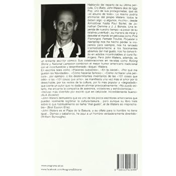 Hablando del reparto de su pelicula Cry Baby, John Waters dice de Iggy Pop, uno de sus protagonistas, que es el abuelo de todo. Lo mismo podria afirmarse del propio Waters: todos le deben algo y algunos, mucho, desde Almodovar hasta Paul Bartel, de Jonathan Demme a J. J. Beneix. Una leyenda de nuestro tiempo a pesar de su relativa juventud, su manera de mirar y desvelar el mundo en peliculas como Pink Flamingos, Female Trouble, Polyester o Hairspray nos ha hecho perder la inocencia para siempre, nos ha lanzado irremediablemente a los fascinantes abismos del mal gusto, nos ha convertido en adictos incontrolables al cursi flamigero. Pero John Waters, ademas, es un brillante escritor comico.Sus colaboraciones en revistas como Rolling Stone y National Lampoon combinan el mejor humor americano tradicional con el inconfundible y desenfrenado toque Waters. / From Almodóvar to Paul Bartel, and Jonathan Demme to J.J Beneix, many owe something to John Waters, and some even more... He is a legend of our times. His way of seeing and unveiling the world in films such as Pink Flamingos, Female Trouble, or Hairspray has caused us to forever lose our innocence, as it has launched us into the fascinating abyss of bad taste, turning us into uncontrollable addicts of all things flamboyant. John Waters is also a brilliant comic writer, his contributions to magazines such as Rolling Stone and the National Lampoon combine the best traditional American humour with the unmistakable Waters touch.