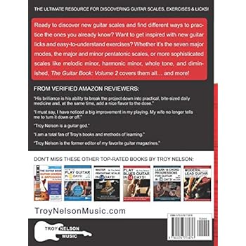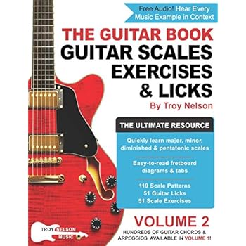 Guitar scales presented in easy-to-read fretboard diagrams and tabs makes learning new scales fast and fun! Whether it’s the seven major modes, the major and minor pentatonic scales, or more sophisticated scales like melodic minor, harmonic minor, whole tone, and diminished, The Guitar Book: Volume 2 covers them all… and more!If you’re interested in discovering new guitar scales or finding different ways to practice the ones you already know, or perhaps you’re just looking to get inspired by learning some new guitar licks, then you’ve come to the right place!Covering nearly 100 pages, Volume 2 is the ultimate resource for guitar scales, guitar exercises, and guitar licks. Inside this book, you'll find:• 17 Scales• 119 Scale Patterns• 51 Guitar Licks• 51 Scale Exercises• Major Modes• Pentatonic Scales• Blues Scales• Diminished & Whole-Tone ScalesThe Major Modes: Ionian, Dorian, Phyrgian, Lydian, Mixolydian, Aeolian, and LocrianPentatonic Scales: Major, Minor, Blues, and Major BluesMinor, Diminished, and Whole-Tone Scales: Harmonic Minor, Melodic Minor, Half-Diminished, Diminished, Dominant Diminished, and Whole ToneScale Exercises: Three-Note Sequence, Four-Note Sequence, and Diatonic 3rds & 4thsGuitar Licks: Ionian, Dorian, Phyrgian, Lydian, Mixolydian, Aeolian, Locrian, Major Pentatonic, Minor Pentatonic, Blues Scales, Major Blues Scale, Harmonic Minor, Melodic Minor, Half-Diminished, Diminished, Dominant Diminished, and Whole TonePlus, get FREE access to instant audio downloads from Troy’s website, troynelsonmusic.com.All of the material is presented in easy-to-understand fretboard diagrams and tab, making learning fast and fun!Author Troy Nelson has been playing guitar for over 30 years and has a passion for helping others learn to love the guitar as much as he does.From the author of the 10-year bestseller Guitar Aerobics (Hal Leonard), Troy Nelson once again brings his easy-to-follow guitar teaching style to this helpful guitar resource handbook.Free shipping with Amazon Prime.Buy it now in paperback or Kindle books!Also available: The Guitar Book: Volume 1 – The Ultimate Resource for Discovering New Guitar Chords & ArpeggiosAbout Troy Nelson: Troy is the former Editor of top guitar magazines Guitar One (sister publication of Guitar World) and Guitar Edge. After earning a degree in Occupational Music, Troy launched his music editing career at Hal Leonard Corporation, the world's largest print music publisher.Here's what others have to say about guitar lesson book author Troy Nelson: "Troy Nelson, guitar god." – Amazon reviewer"I'm a total fan of Troy's books and method of learning." – Amazon reviewer"Troy Nelson, former editor of my favorite guitar magazines." – Amazon reviewer"His brilliance is his ability to break the project down into practical, bite-sized daily medicine and, at the same time, add a nice flavor to the dose." – Amazon Reviewer, Fretboard Freedom"I must say, I have noticed a big improvement in my playing. My wife no longer tells me to turn it down or off." – Amazon Reviewer, Guitar Aerobics"Another winner from Troy Nelson." – Amazon reviewer, Rhythm Guitar 365"I LOVE this book. It's my first purchase from Troy Nelson, and it's got me interested in his other books" – Amazon reviewer, One-Man Guitar Jam